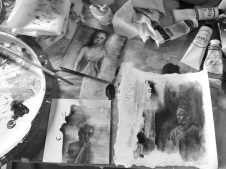 Parallel Portrait (series) oil, charcoal, rice paper, acrylic on panel, 4″x4″