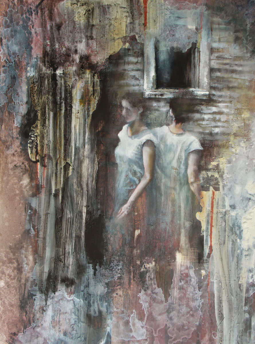 Impasse oil, conte, graphite, acrylic, pigmented water on clay board, 12″x16″